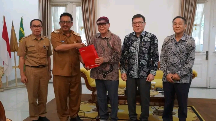 Potret Sukabumi,- Bupati Sukabumi H. Asep Japar beraudiensi dengan Trade Advisor of Gyeongsangnamdo Provincial Government, Korea Selatan dan Direktur PT. VDF Jaya Indonesia Mr. Noh Chang Dong di Pendopo, Senin, 19 Mei 2025. Dalam audiensi yang didampingi Sekda Kabupaten Sukabumi H. Ade Suryaman dan sejumlah kepala perangkat daerah ini, membahas berbagai hal. Terutama berkaitan beasiswa kuliah di University of Gyeongnam Namhae.