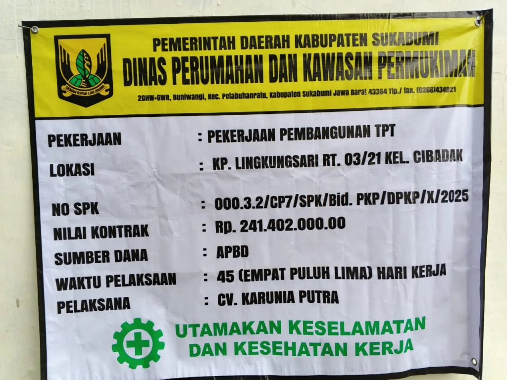 Berdasarkan papan informasi proyek yang terpasang di lokasi, pekerjaan tersebut memiliki nilai kontrak sebesar Rp241.402.000 yang bersumber dari Anggaran Pendapatan dan Belanja Daerah (APBD) dengan waktu pelaksanaan 45 hari kerja. Proyek ini dilaksanakan oleh CV Karunia Putra sesuai SPK Nomor 000.3.2/CP7/SPK/Bid.PKP/DPKP/I/2025.