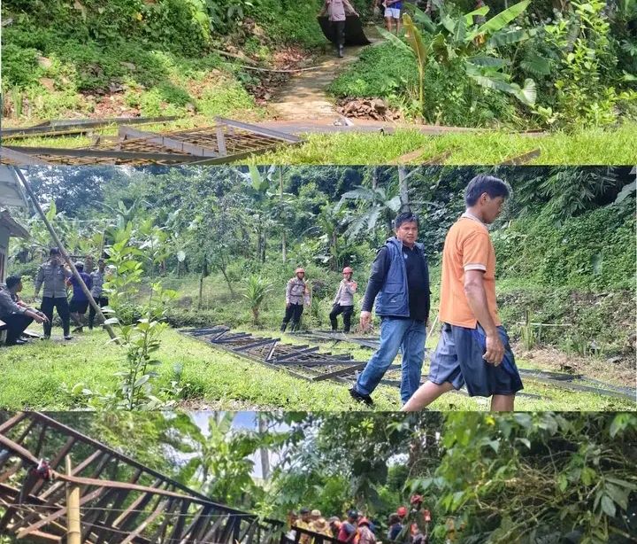 Pekerjaan dilakukan bersama jajaran Polres Sukabumi, pemerintah desa, dan masyarakat setempat. Tahapan dimulai dari pengangkutan material, pembongkaran jembatan lama, hingga pembuatan pondasi.