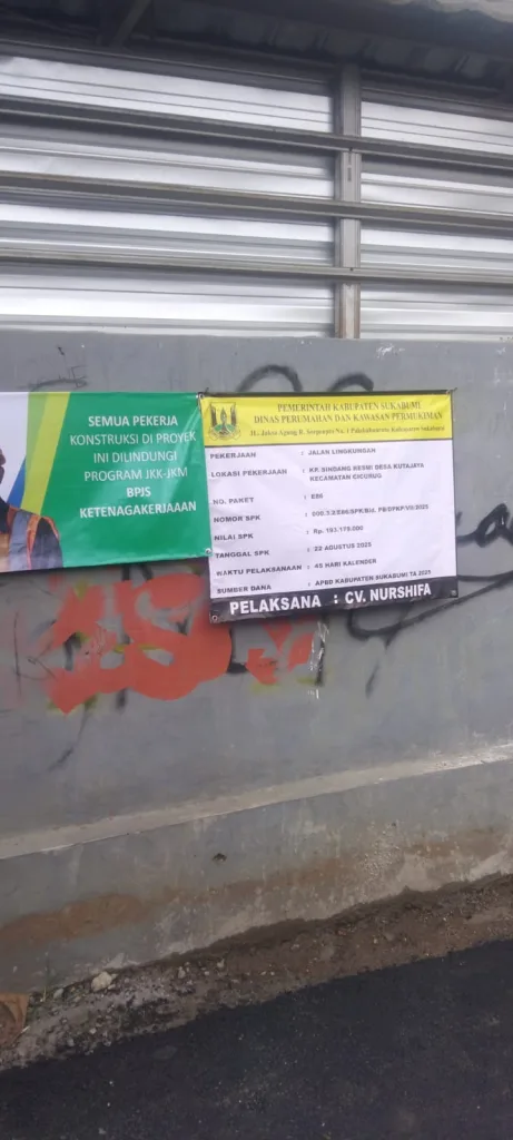 Perbaikan jalan lingkungan ini merupakan bagian dari kegiatan infrastruktur yang bertujuan meningkatkan kualitas jalan dan aksesibilitas warga. Proyek ini bersumber dari Anggaran Pendapatan dan Belanja Daerah (APBD) Kabupaten Sukabumi.