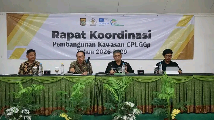 Potret Sukabumi — Sekretaris Daerah Kabupaten Sukabumi H. Ade Suryaman membuka Rapat Koordinasi (Rakor) Pembangunan Kawasan Ciletuh–Palabuhanratu UNESCO Global Geopark (CPUGGp) Tahun 2026–2029 di Hotel Augusta Palabuhanratu, Jumat (10/10/2025).